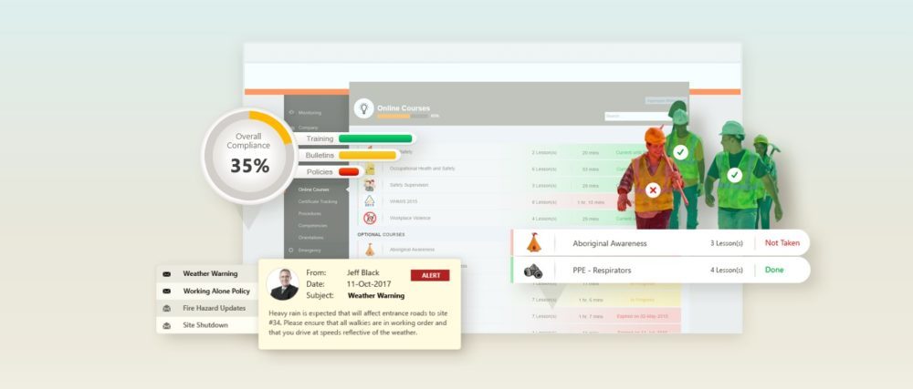 • Field credentials • Billeting and alerts • Safety policies • Certificate tracking • Competency assessments • Emergency contacts database • Equipment management • Action items • Safety data sheets • Legislation hosting • Single LMS • Incident tracking