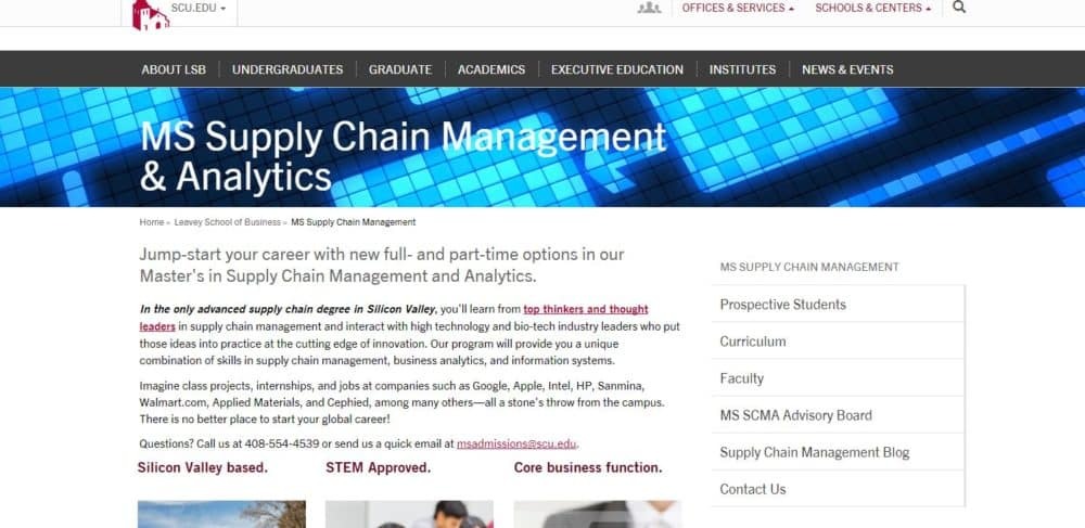 The Master of Science in Supply chain management, from Santa Clara University combines supply chain management topics, courses in business analytics and information systems. Supporting disciplines such as information systems, marketing, finance, and business analytics, gives skills necessary for excellence in these fields.