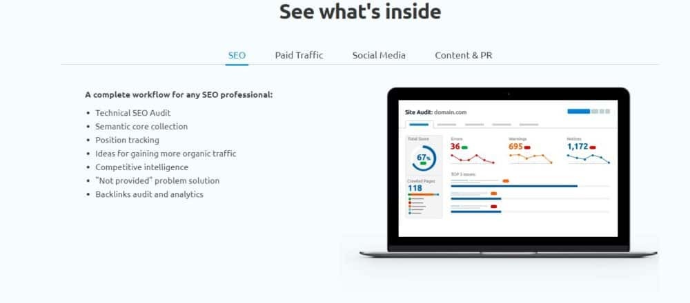 SEMrush is an all-in-one digital marketing suite with tools for all of the following professional services: SEO, PPC, Keyword Research, Public Relations and more.