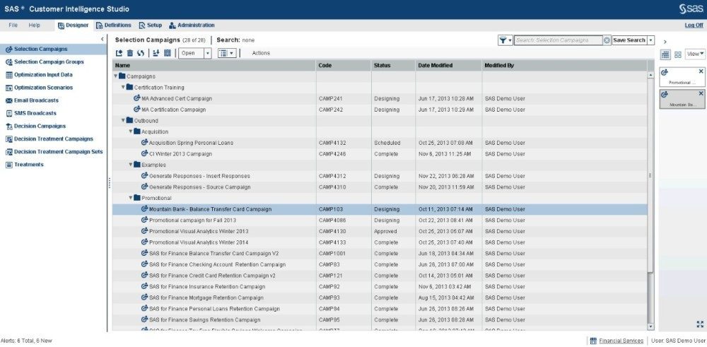 SM-MCI will also use SAS Visual Analytics for pre-campaign profiling to identify the best campaign, target segments and post-campaign reporting to measure performance and ROI. SAS Customer Intelligence solutions use analytics to help organizations better understand their customers and develop targeted and effective marketing strategies to reach them. The SAS offerings use a decision-hub approach that combines: