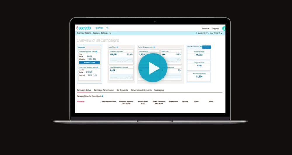 Socedo helps to engage the target prospects from Twitter via email, by syncing contacts with corporate email addresses into the marketing automation or CRM system. Socedo supports integrations with Marketo, Oracle Eloqua, HubSpot, Salesforce Pardot, and Salesforce CRM. The user can also export leads via CSV. Socedo enriches each contact with up to 50 data points including demographic, firmographic and social media engagement data so that they can create campaign segments, prioritize the leads, and reach each person in context.