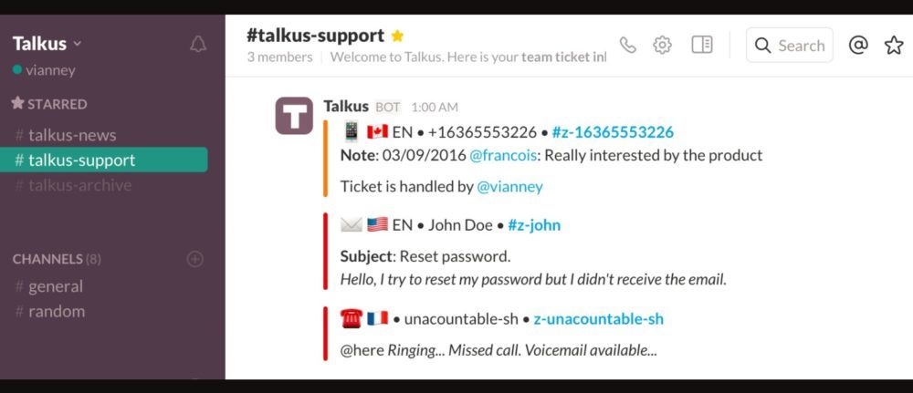 • It doesn't matter how users choose to connect with you; live chat, email, text messaging, calls - you see everything in one place, Slack.