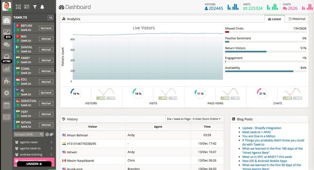 tawk.to is a free messaging app which offers features such as Group Messaging, Video & Voice (Add-on), Agent > Agent Messaging, Desktop Notifications, 1880+ Emoji, Geo IP Tracking, Track Sentiment, Track Engagement, Detailed Reporting and Ban/Unban Visitors.