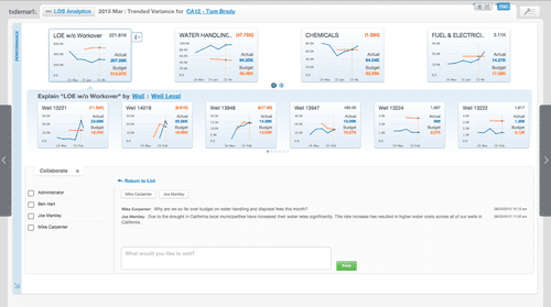 The use of Tidemark is also transforming planning and forecasting at oil and gas supplier, Laredo Petroleum, which operates over 1,000 wells on more than 150,000 acres in the Permian Basin of West Texas. Before implementing Tidemark, Laredo Petroleum supervisors and foremen had to wait up to two weeks to learn how much revenue a particular rig was producing or whether it made financial sense to continue or stop drilling on a site. Today, managers and field personnel alike can access Tidemark's modern-cloud, mobile-first platform to get answers to those questions immediately, enabling them to save expenses by taking the right actions sooner.