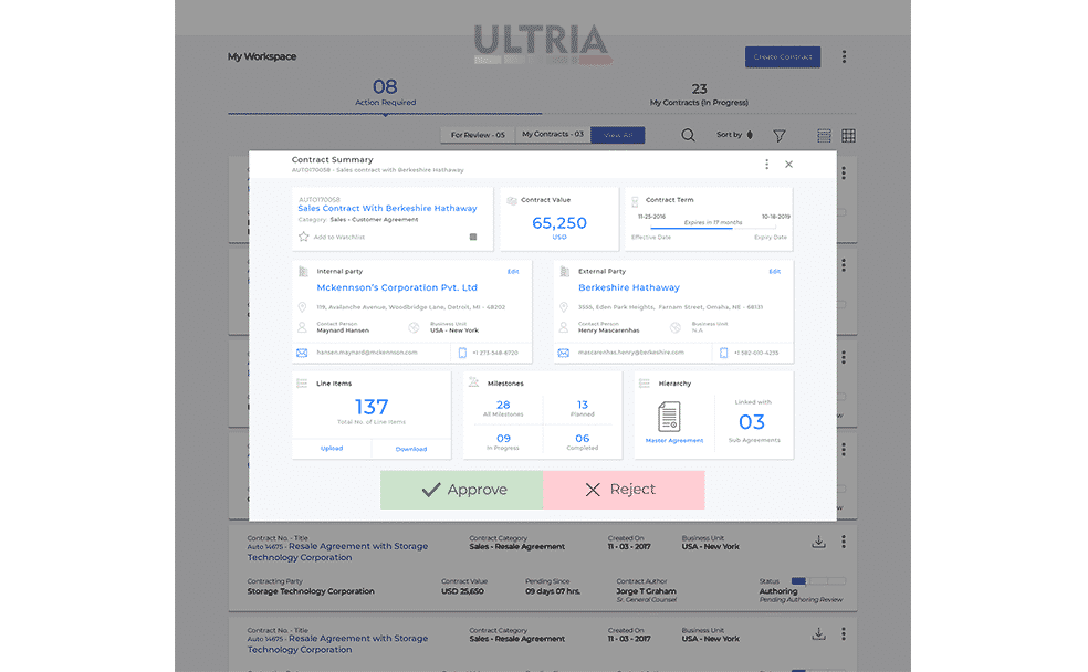 Ultria contract management is available for its users on the app stores. Its mobile app makes life simple as users can execute various routine tasks on the go like tracking approvals, receiving alerts and reminders, approving contracts, collaborating with other stakeholders.