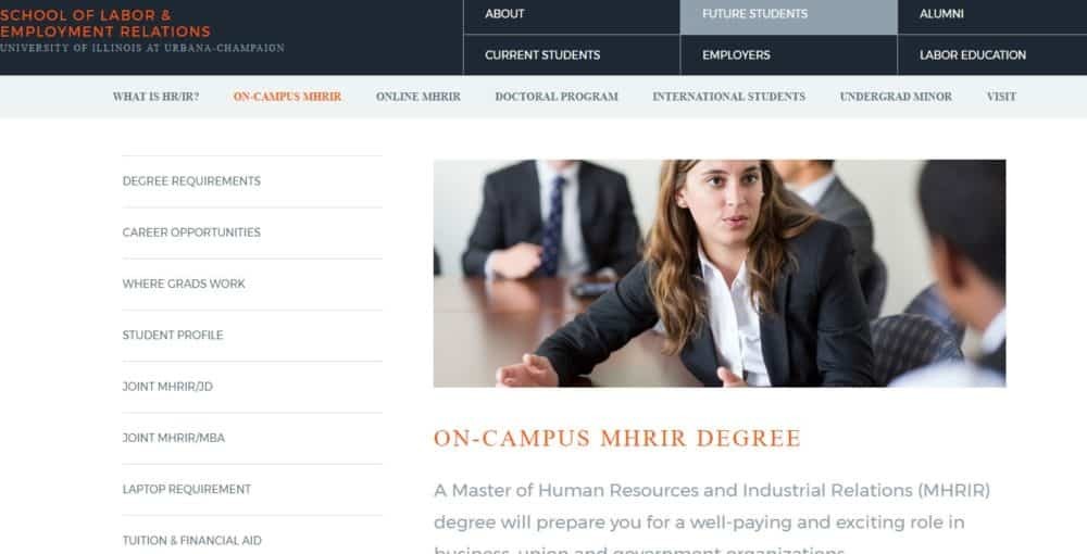 The University of Illinois’ Master of Human Resources and Industrial Relations (MHRIR) degree program examines conceptual issues, policies, and practices relating to the attraction, selection, development, and planning for effective utilization of human resources. Students also get to learn how human resource professionals fit into the organization, structure, and function of business firms.