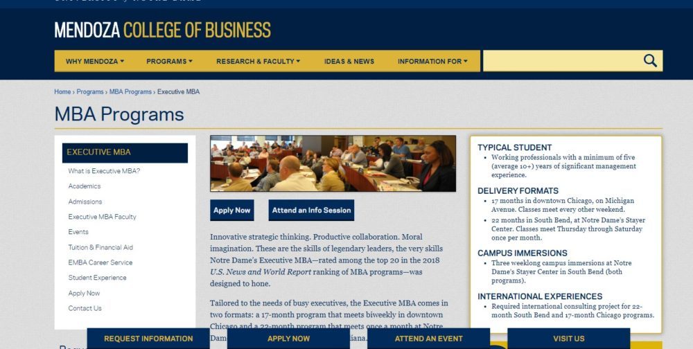 University of Notre Dame, Mendoza College of Business, Executive MBA