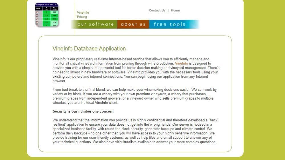 VineInfo currently provides viticultural web services to more than 1,000 acres of ultra-premium vineyards throughout Napa and Sonoma Valleys. VineInfo provides you with the necessary tools using existing computers and internet connections. Begin using VineInfo application from any Internet browser. From bud break to the final blend, VineInnfo can help make winemaking decisions easier.