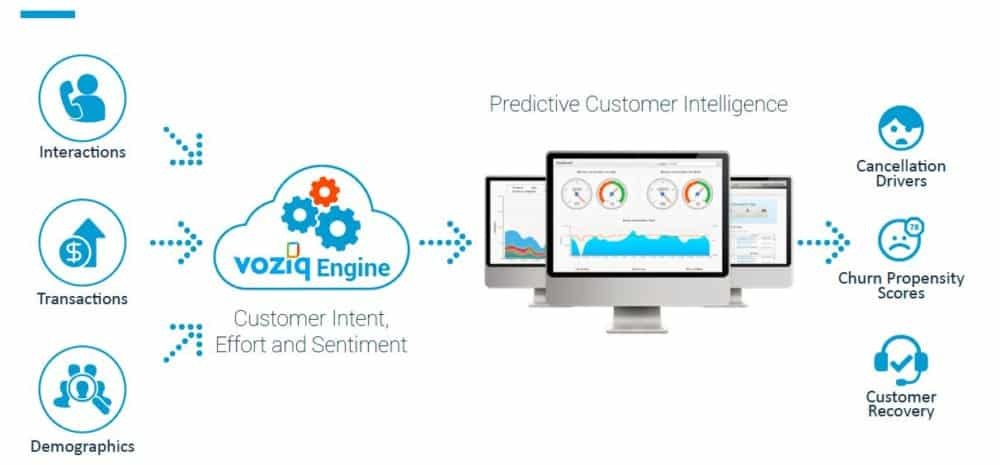VOZIQ’s Predictive Churn Reduction Solution : VOZIQ’s Predictive Churn Reduction Solution leverages cloud-based text analytics platform, closed-loop analytics frameworks and to customer success support team to deliver accelerated ROI for enterprises by predicting and preventing customer churn. The platform captures data from multiple contact channels, customer touch points, and disparate contact center systems to provide a largest possible sample of customer data points. The platform then applies text analytics on this aggregated big-data to extract the intent, effort, sentiments of the customer and extrapolates them to predictability of customer journey events. This results in a unified view of the top causes of cancellations, top customers with high churn-propensity along with the opportunities to retain them. The built-in APIs loop the churn propensity scores back into contact channels such as IVR to auto-route the at-risk customers to agents who are skilled at offering proactive solutions to the customer pain points.