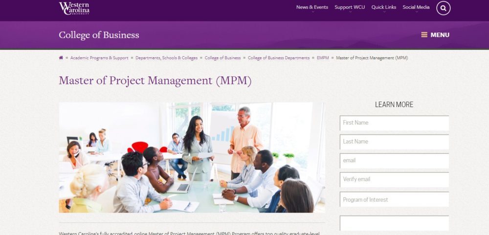 Western Carolina's online Master of Project Management (MPM) is a fully accredited program offering top quality graduate-level training with courses that will advance your project management leadership skills, tools and techniques, so you can manage and lead projects in almost any industry in the business world.