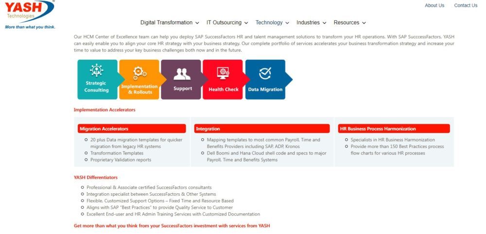 YASH Technologies is a strategic consulting partner of SAP SuccessFactors and is a recognized leader in advising, deploying, and supporting customers throughout their HR technology transformation initiative. Yash help organization to streamline their recruitment process by reducing HR costs and anticipate workforce needs by measuring employee performance to provide maximize returns on their investments.